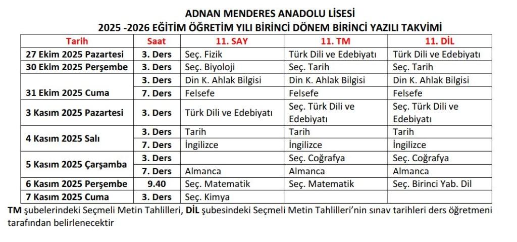 2025-2026 Eğitim Öğretim Yılı 1. sınav takvimi